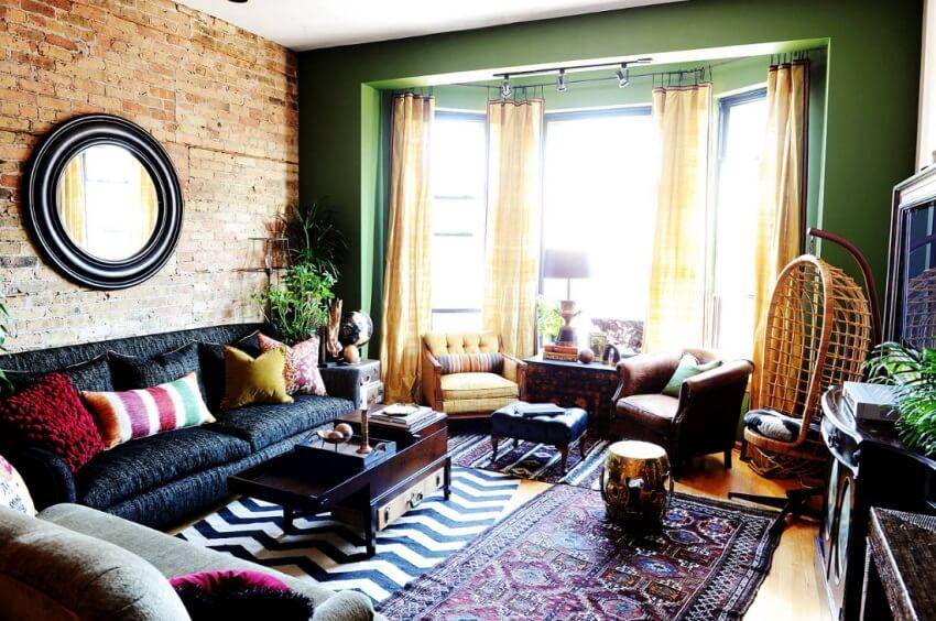 Здесь уместны классические формы мебели и традиционный текстиль: гобелен, бархат, хлопок и шелк. Интерьер в стиле бохо может нести этнические очертания в виде узорчатых ковровых дорожек, ширм с восточным орнаментом. Как в классическом варианте, обстановка комнаты может быть выполнена с использованием нейтральных природных оттенков, листвы, песка, неба, но е обязательно должны освежать яркие пятна и цветовые сочетания, к примеру, в текстиле, декоративных предметах и аксессуарах для штор (кутасы, подхваты, кисея)