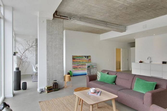 Эффектно будет смотреться минималистично обставленная комната с отделкой из бетона. Несколько ярких деталей завершат интерьер, например яркий постер или покрывало.
