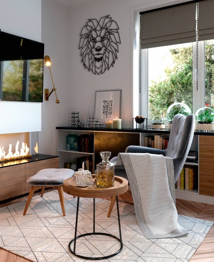 Если интерьер оформлен в скандинавском стиле, уместны рога оленей, скандинавские пейзажи, декор из камня.