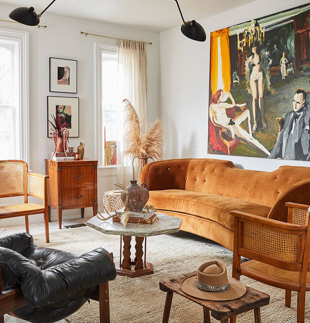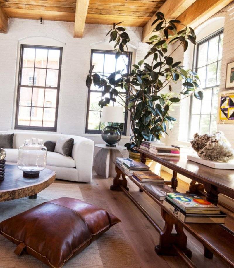 На фото гостиная в стиле гранж. Интерьер наполняют предметы мебели из натуральных материалов.