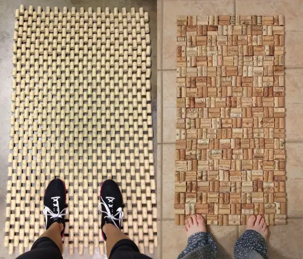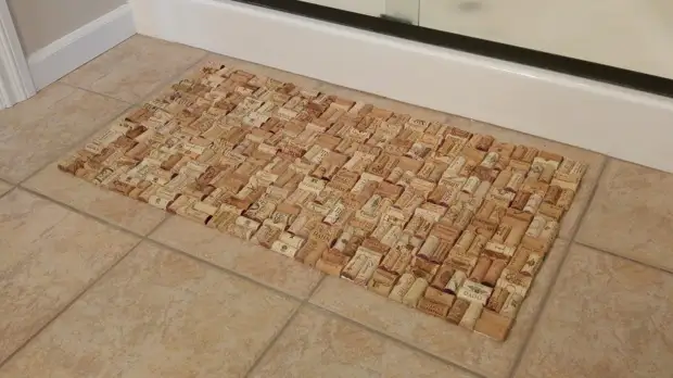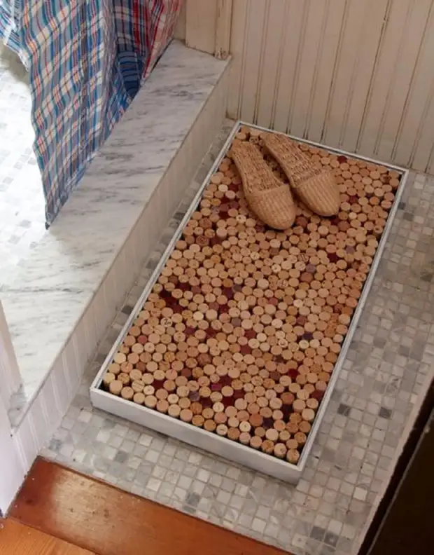 Осмотрите пробки. От красного вина замочите в отбеливателе, чтобы выровнять цвет. Просушите. Разрежьте каждую пробку вдоль на равные части. Если нож оказался недостаточно острым обработайте края материала наждачкой. Половинки должны быть одинаковых габаритов. Проведите тренировку: выкладывайте элементы по периметру основы с левого верхнего угла. Если рамка сошлась в точке входа, начинайте приклеивать половинки. Закончив работу положите новый коврик под пресс для выравнивая. Держите так пока сохнет, сверьтесь с инструкцией о времени. Оригинальная вещь для ванной готова!