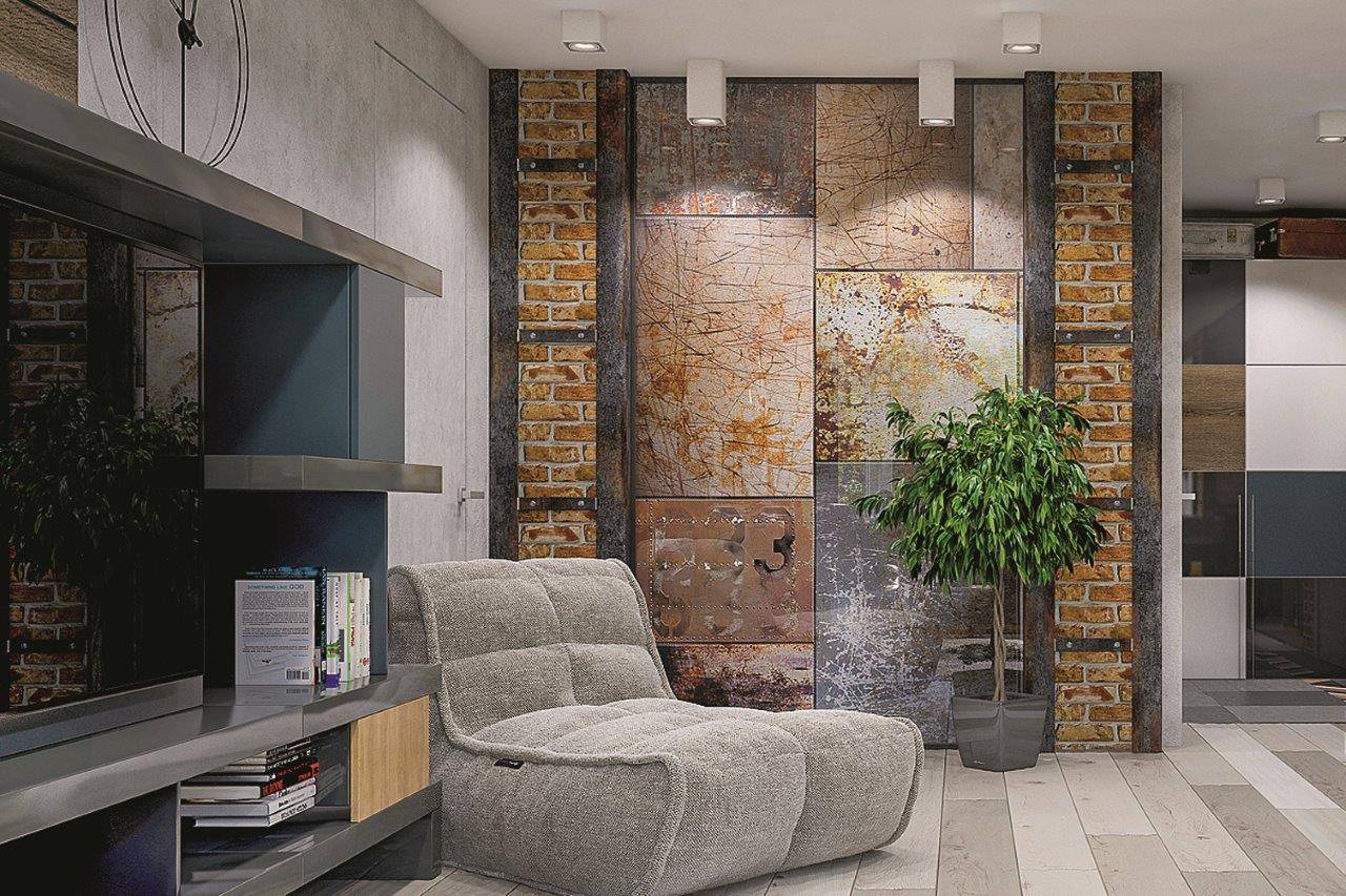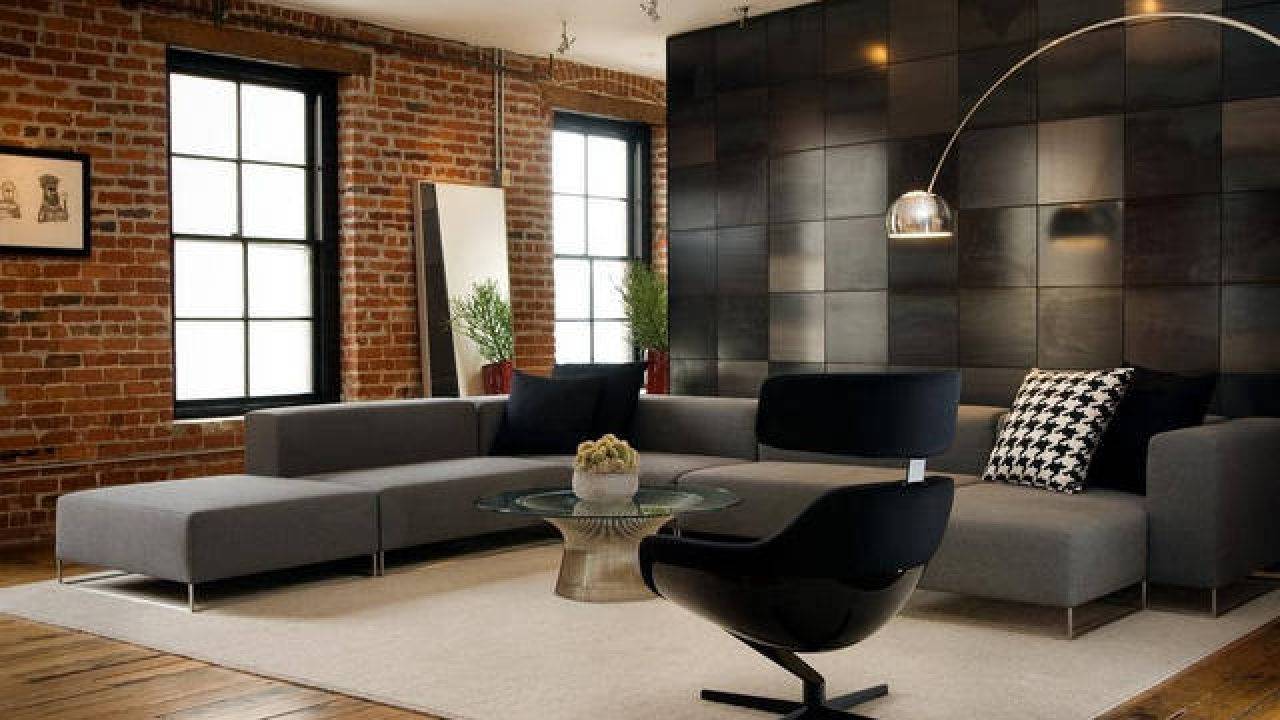 Например, белая кирпичная стена сочетается с серым диваном. Или же сделать акцент на желтом широком диване простых форм в сочетании с темными стенами.
