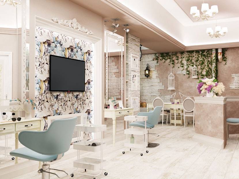 Это поможет выделить зону отдыха и комфорта для ожидания клиентами своей очереди. Мягкий уголок часто разбавляют дизайнерскими подушками с нежной цветовой гаммой.