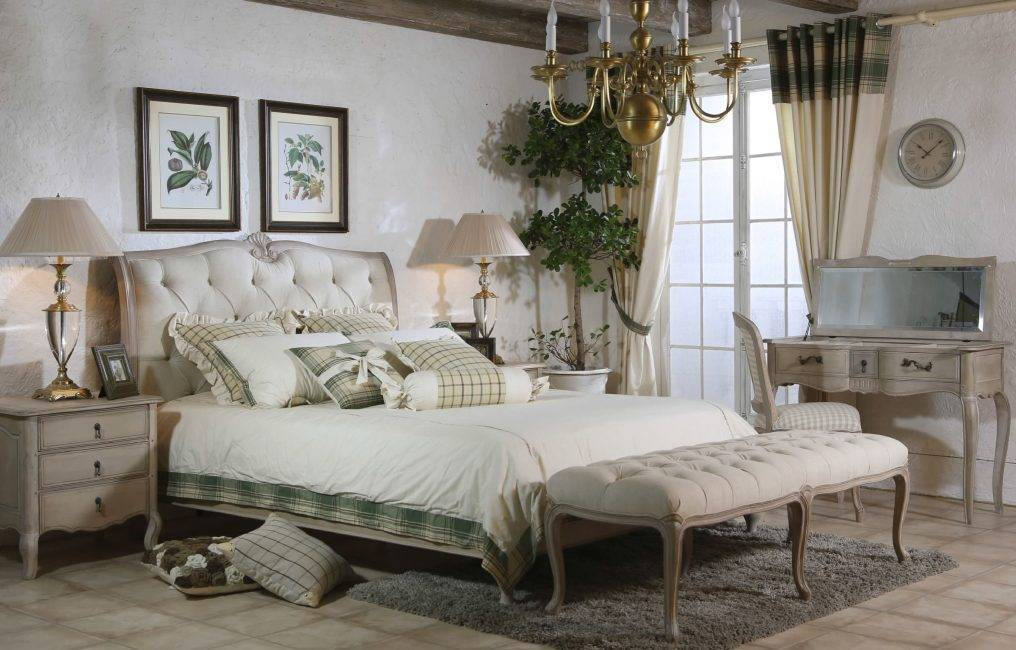 Для обустройства используется светлая мебель из массива. Мебель для спальни в таких помещениях часто окрашена в белый или приглушенный светлый цвет. Она изготовлена из массива березы, ясеня, другой древесины. Имеет резные ножки. Деревянное изголовье, изножье кровати декорируется дощатой фрезеровкой или филенкой.