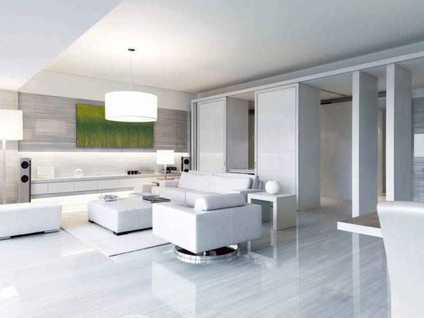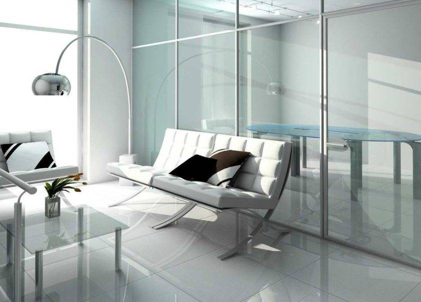 В интерьере гостиной или просторного зала белый диван будет смотреться шикарно и дорого. В просторном помещении классическая прямая модель может быть дополнена группой кресел или пуфиком. Интересно будет смотреться белый круглый или модульный диван.
