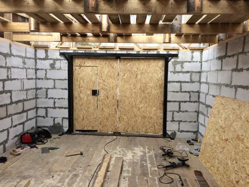 Стенка с проемом под ворота дополнительно усиливается, чтобы без проблем выдерживать нагрузки от открывания-закрывания ворот.