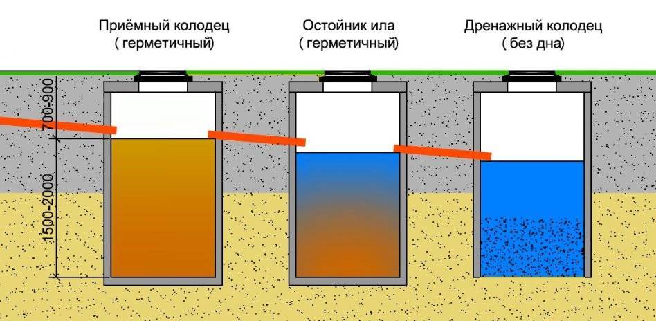 В некоторых ситуациях следует улучшать работу конструкции, устраивая сливную яму с системой перелива. Данная конструкция будет действовать, как септик. Около старого резервуара следует установить подобный. Первый резервуар должен иметь полную герметичность, второй – проницаемым, либо не имеющий дно. При герметичности второго резервуара следует продумать поле фильтрации, куда будут выходить стоки. Перелив монтируют в верхней части емкостей, соблюдая небольшой уклон.