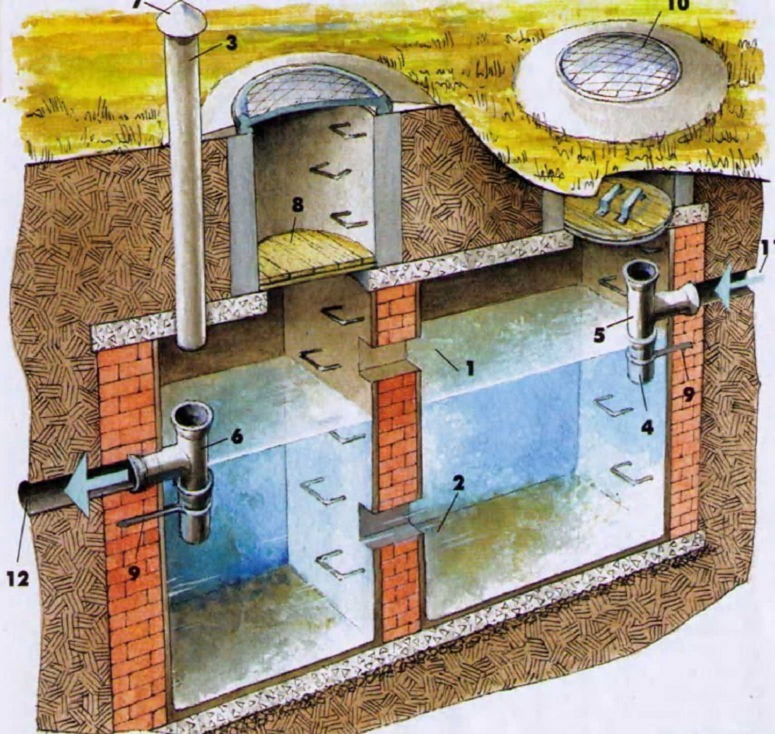Представляет собой «усовершенствованную» выгребную яму. В том плане, что в септике отходы могут находиться дольше, не доставляя неудобства хозяевам, не испуская неприятный запах, например. Это возможно из-за особенностей проектировки септика. Он состоит из нескольких камер, соединенных трубами.