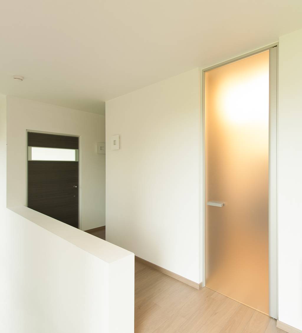 На фото межкомнатные светлые изделия с матовым узорчатым остеклением в коридоре.