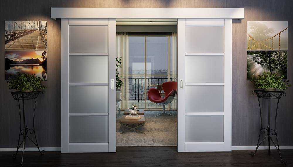 Коль мы говорим именно о квартирах, то в них можно часто видеть двери-купе. В таком случае дверное полотно двигается по специальным рельсам, которые закреплены на поверхности пола и потолка. Существуют модели с разным количеством створок. Работа этих дверей тихая и мягкая.