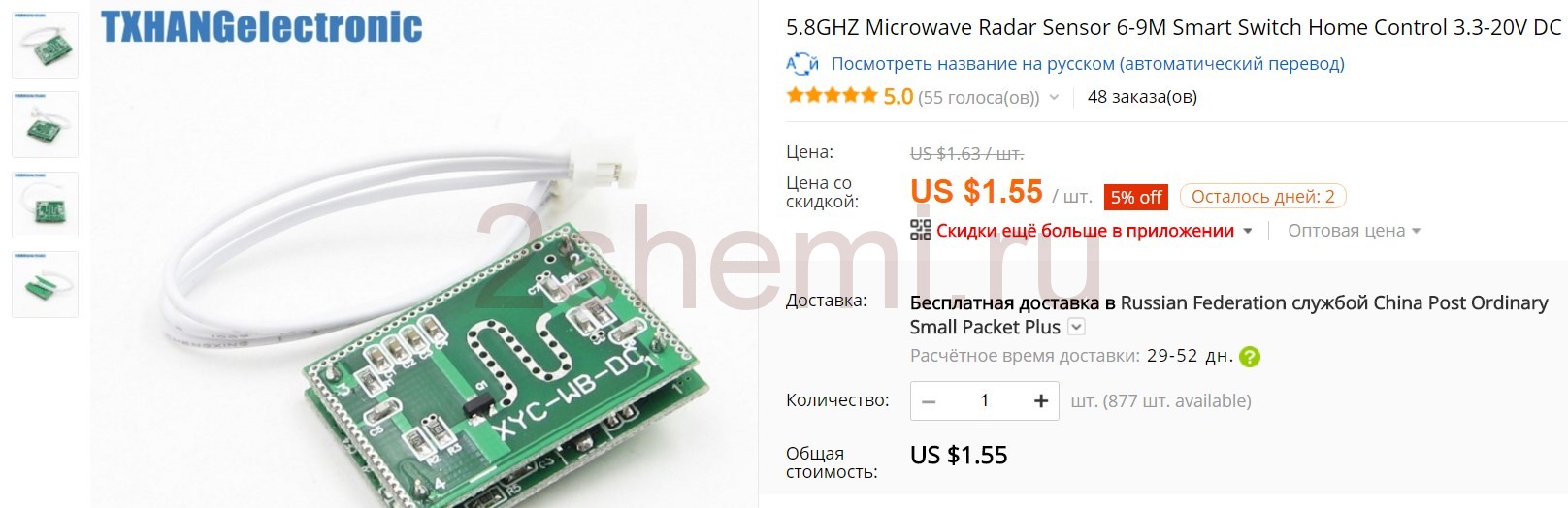 Датчик описанного типа является функциональным аналогом инфракрасного датчика движения, и может заменять его в системах автоматического включения освещения, открывания дверей, сигнализации и других подобных автоматических устройствах. Датчик был приобретен на Ru.aliexpress.com