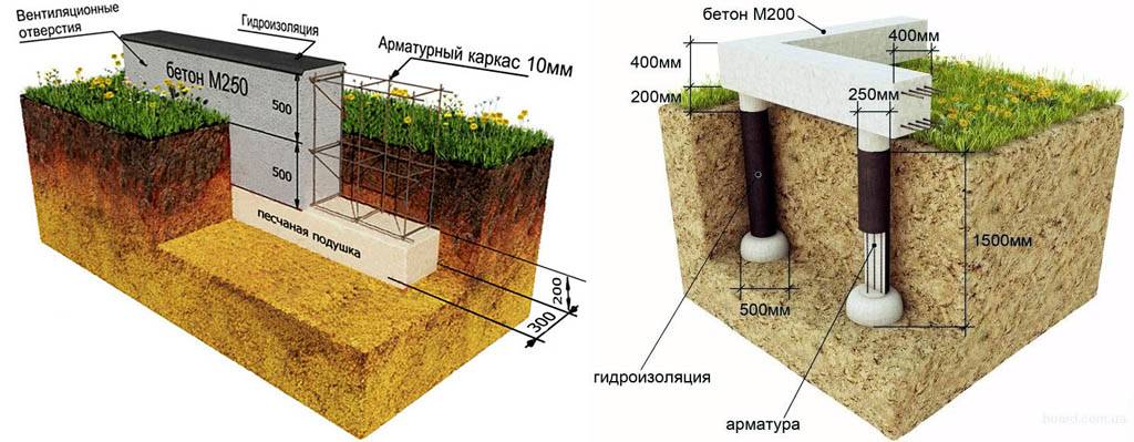 На устойчивых сухих грунтах ради уменьшения объема земляных работ, если постройка из газобетонных блоков, возможно, по рекомендациям проектанта, использовать ленту неполного заглубления, слева на рис. С той же целью и также под газобетонное сооружение, но уже на среднепучинистых и обводненных до 0,9 м грунтах пригоден фундамент ТИСЭ, справа.