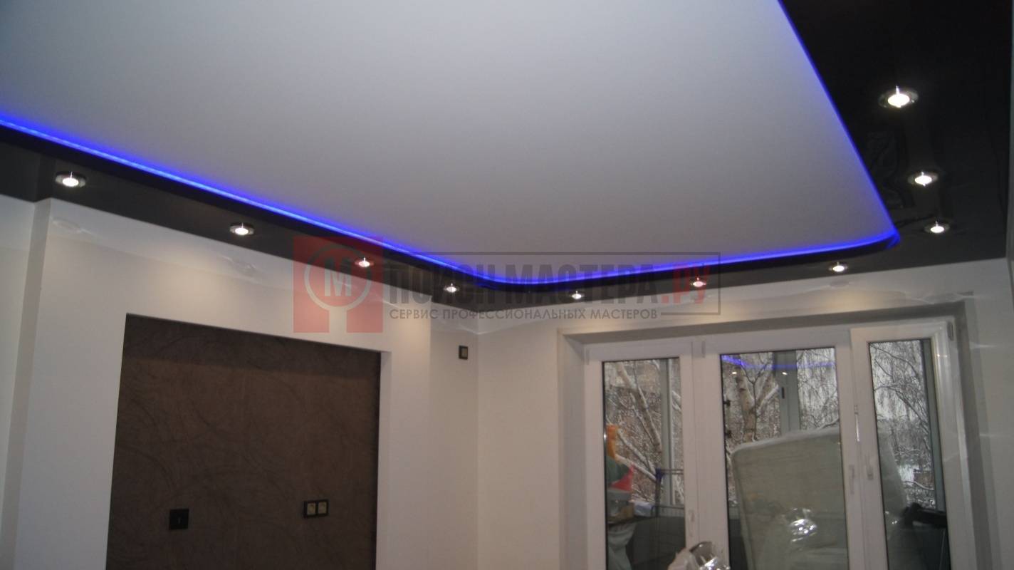 Достаточно часто для организации потолка используется 2 и более материала. Например, по периметру потолка можно собрать гипсокартонную конструкцию, в которой обустроить нишу для осветительных приборов, а для второго уровня использовать натяжной вариант.