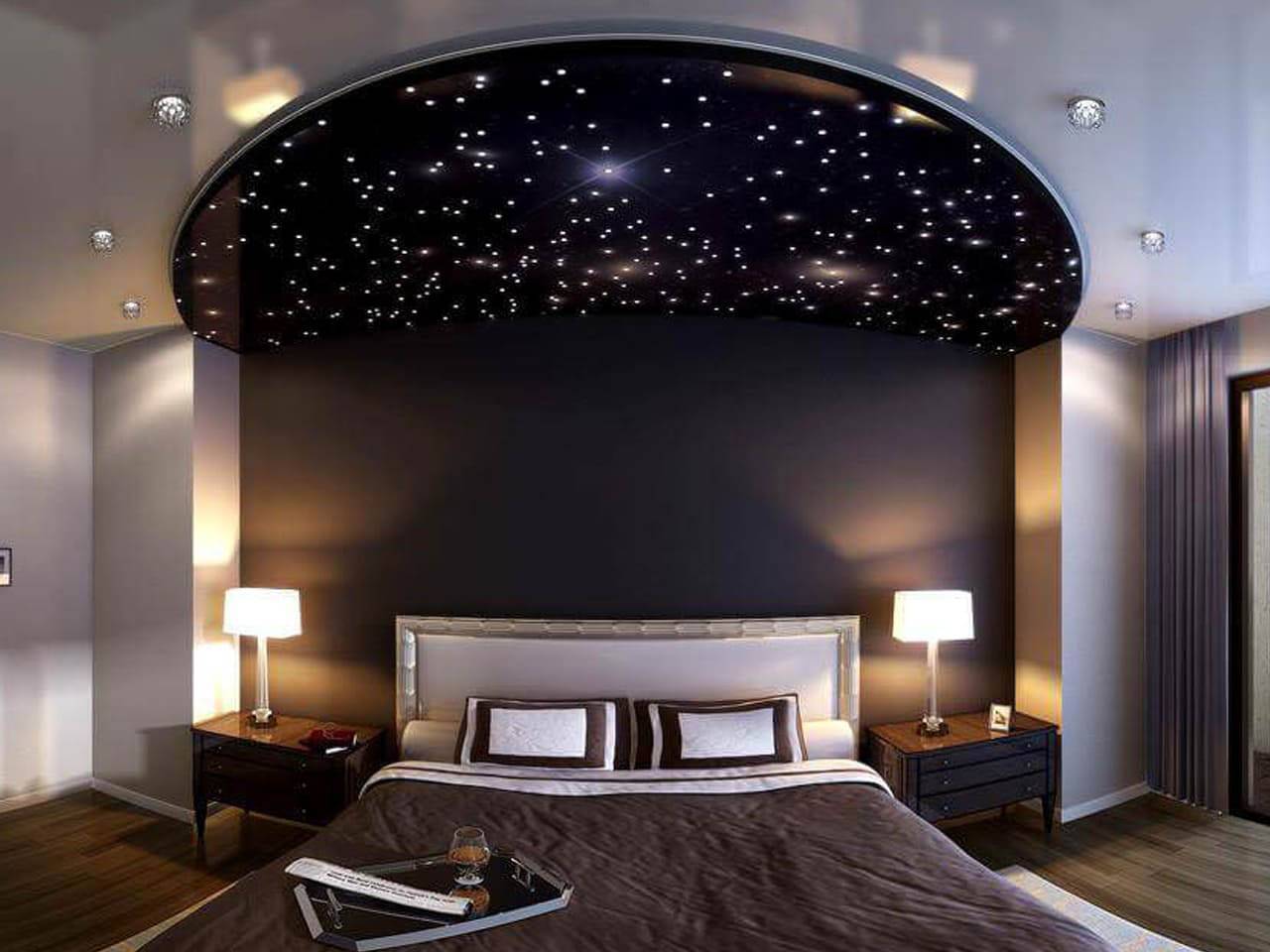 Интересно выглядят в спальнях двухуровневые конструкции с эффектом «звездного неба» или задекорированные геометрическими фигурами в виде цветов.