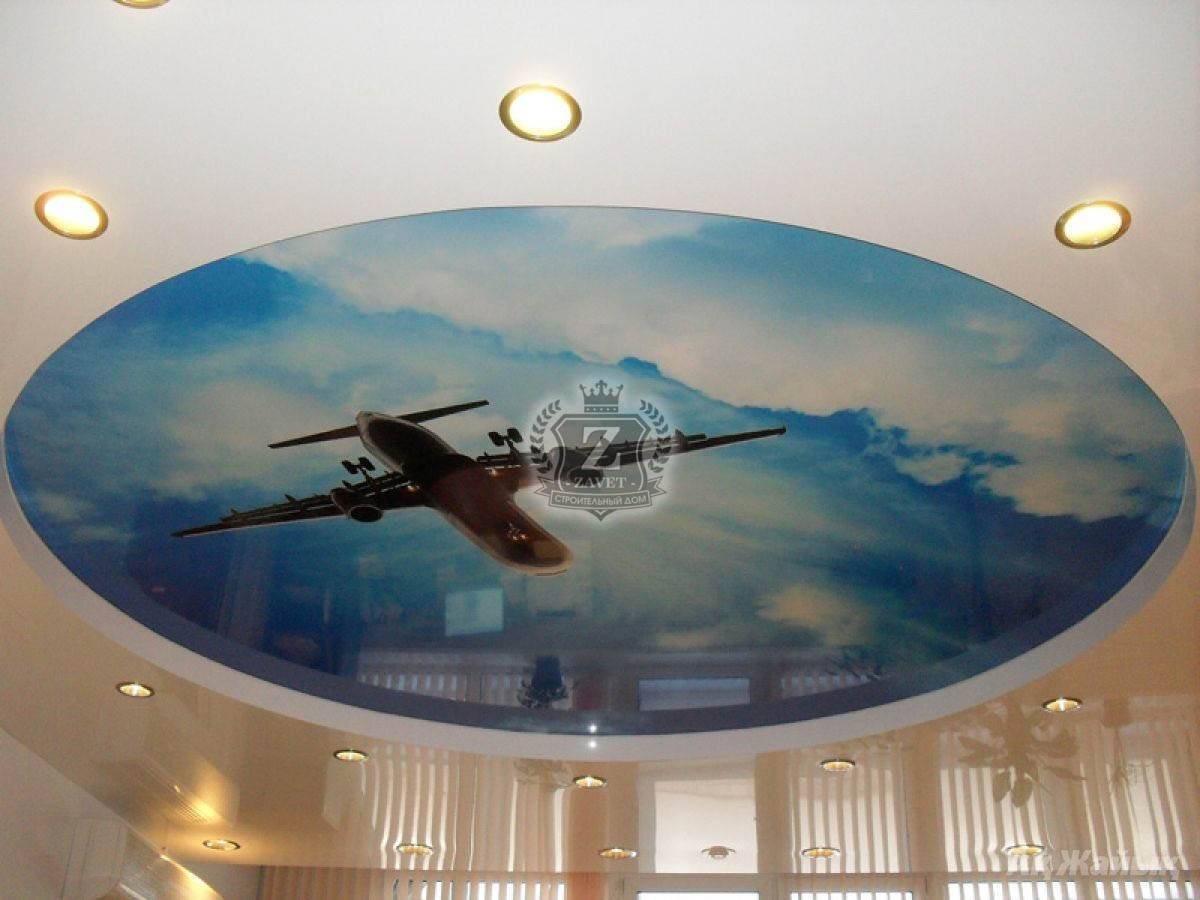 Самый распространенный вариант – это комбинированный потолок. На основном периметре будет располагаться тканевое полотно или ПВХ, а по бокам размещается гипсокартонный короб. Многие дизайнеры рекомендуют оснащать такие конструкции фотопечатью.
