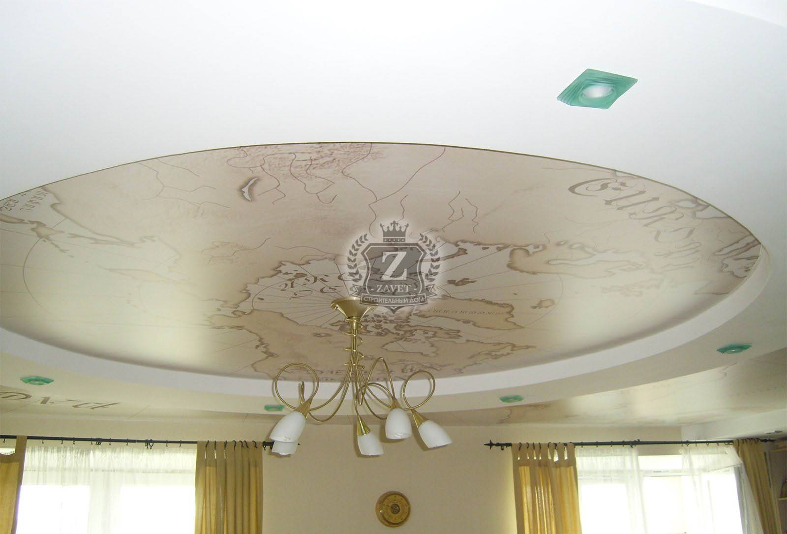 Многие дизайнеры предлагают расписать первый ярус, а второй оставить однотонным. Он может быть оформлен замысловатыми фигурами по всей площади полотна. Также второй уровень может обладать овальной или круглой формой в центре. Светильники располагаются между уровнями, а в центре присутствует изящная люстра в классическом оформлении.