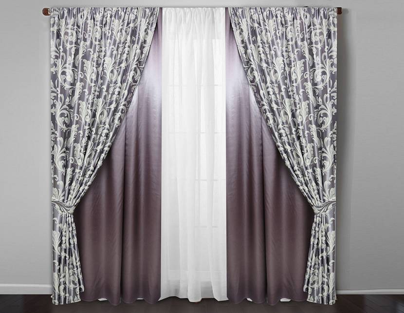 - акцент на тюле. Такой вариант подойдет для просторных помещений, ориентированных на западную или северную сторону. Фотопечать, броский орнамент должен лишь подчеркиваться простотой и лаконичностью штор.