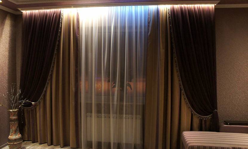 Иногда декоративную деталь, наоборот, изготавливают из контрастной материи, но в этом случае ламбрекен должен гармонировать с интерьером гостиной и не выглядеть вычурно. Для интерьера в классическом стиле или барокко лучше подбирать плотные ткани. Отлично подойдут бархат или плюш, атлас и хлопок, лен и жаккард. Такие материалы привносят в интерьер атмосферу некой торжественности. И если работать с атласом нужно аккуратно, а бархат может растягиваться, то хлопок и лен не требуют особых усилий.