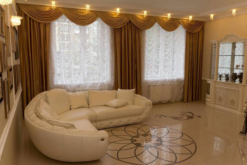 Классическая модель штор в зал с легкими ламбрекенами и сборкой. Модель идеально подойдет для зала в стиле прованс или кантри, а также в классическом оформлении. В хай-тек варианте зала такие шторы придадут изюминки и будут смотреться необычно.
