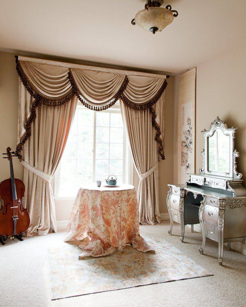 Фиолетовый, сиреневый и изумрудный цвет штор и ламбрекенов идеально впишутся в стиль барокко или арт-деко. Учтите, если вы хотите поэкспериментировать с контрастными тонами ламбрекена, помните, что один цвет должен быть нейтральным, пастельным, а второй может быть ярче.