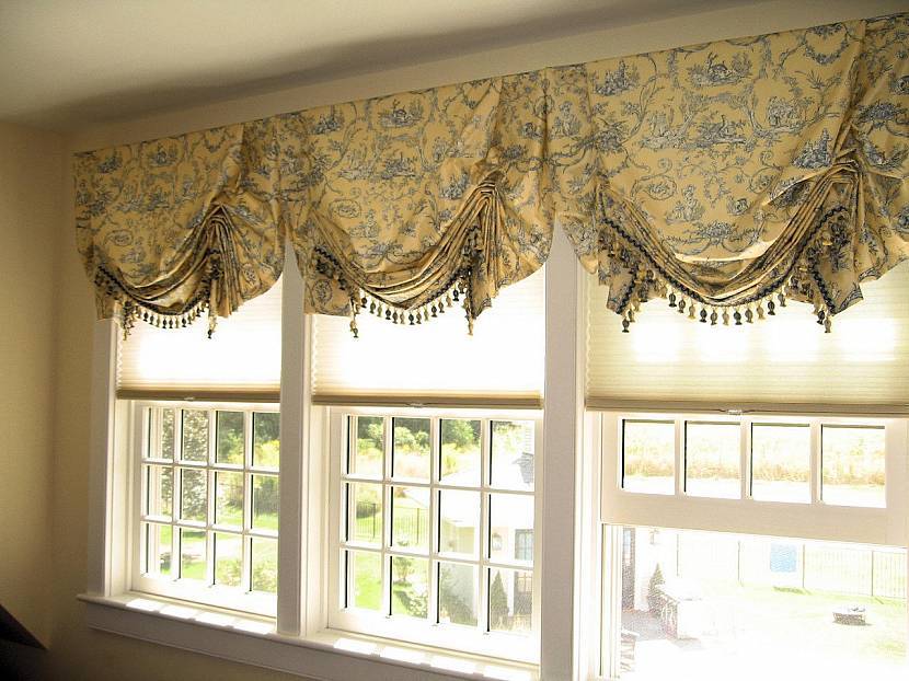 Тип драпировки зависит от способа сборки, крепления и расположения ткани (по долевой или по косой линии). Красиво смотрится комбинация горизонтальных ламбрекенов в сочетании с вертикальными украшениями.