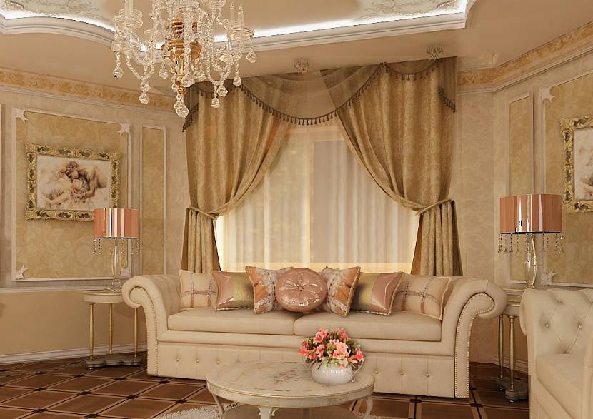 Шторы в зал в классическом стиле подойдут под любые типы оконных рам. В малом зале можно окно визуально расширить при помощи светлых оттенков. А в большом помещении сделать выгодный акцент.