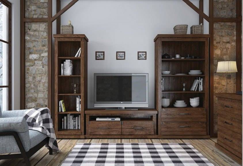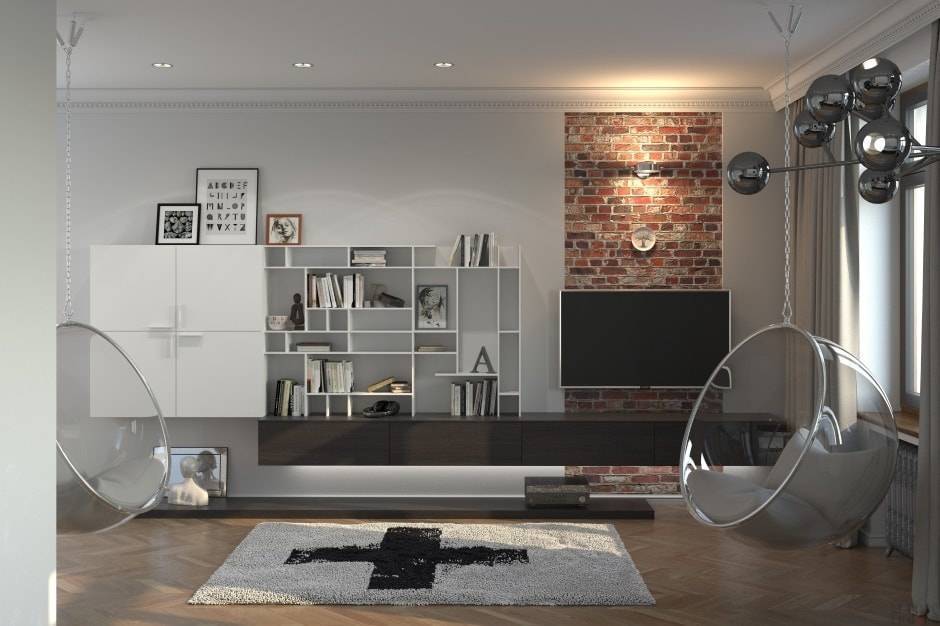 Чаще всего это платяной шкаф, тумба под аппаратуру, подвесные шкафчики для мелких вещей и посуды, стеллажи для книг. Некоторые варианты дизайна предполагают открытые или застекленные витрины – они придают изящество и воздушность интерьеру. При необходимости модульные элементы можно перенести в другие комнаты, например, платяной шкаф в спальню, а сервант для посуды в кухню. Этот вариант применим только в том случае, если кухня или спальня совмещены с гостиной или находятся в едином стилевом оформлении.