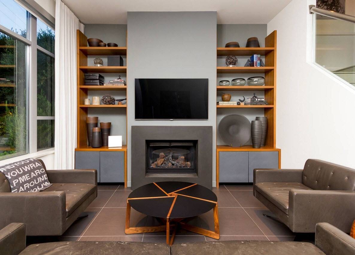 Различные варианты оформления стенок горок в гостиной в современном стиле можно увидеть на фото.