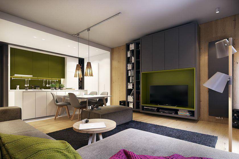 В маленькую комнату идеальным вариантом установки будут небольшие прямые и угловые стенки Г-образной формы. Для корректировки узкой планировки используются модульные системы, в которых крупные вместительные блоки дополнены маленькими и низкими. В однокомнатную квартиру часто устанавливают модульную стенку с вместительными ящиками и тумбой под телевизор. Пространство, которое займет подобное изделие, компенсируется высокой функциональностью.
