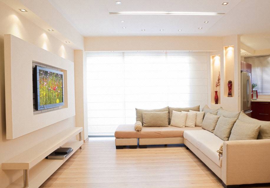 Минимализм – идеальное решение для небольших помещений. Здесь минимум декора и мебели, лишние предметы и украшения здесь отсутствуют. Мебель должна быть небольшой и функциональной. Для цветового оформления выбирают два основных цвета, без добавления каких-либо дополнительных оттенков. Зачастую гостиную выполняют в ненасыщенных тонах синего, бежевого или серого цветов.