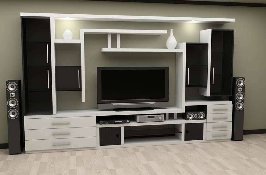 Место для экрана выбирается на уровне глаз сидящего человека. Поэтому принято напротив корпусной мебели устанавливать уютные диваны и кресла, формируя зону отдыха. Нередко в нишах мебельных гарнитуров предусматривается возможность скрыть технические провода. Устанавливая секцию под телевизор, следует проверить, имеются ли там розетки.