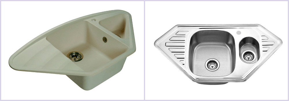 - угловая мойка для кухни — популярная форма, отлично подходит для кухни небольшого размера, экономит пространство. Из недостатков то, что она не очень вместительная и за ней нужно хорошо ухаживать.