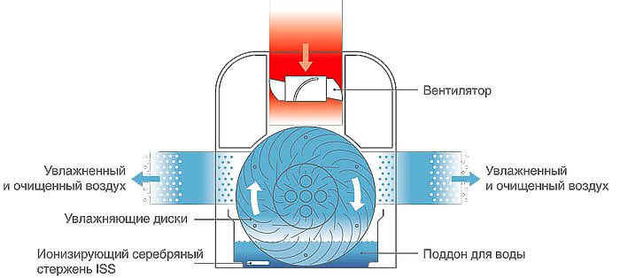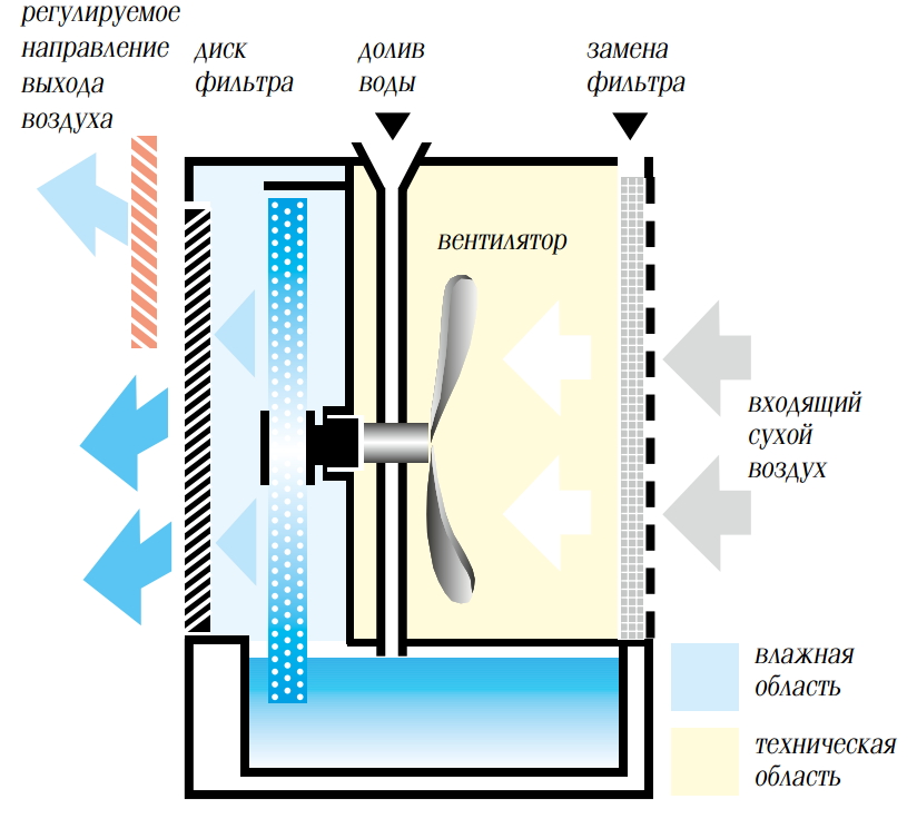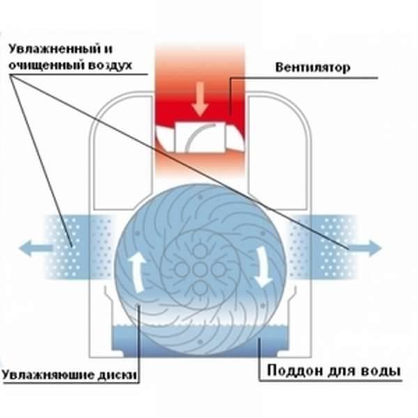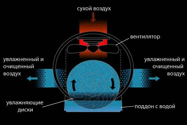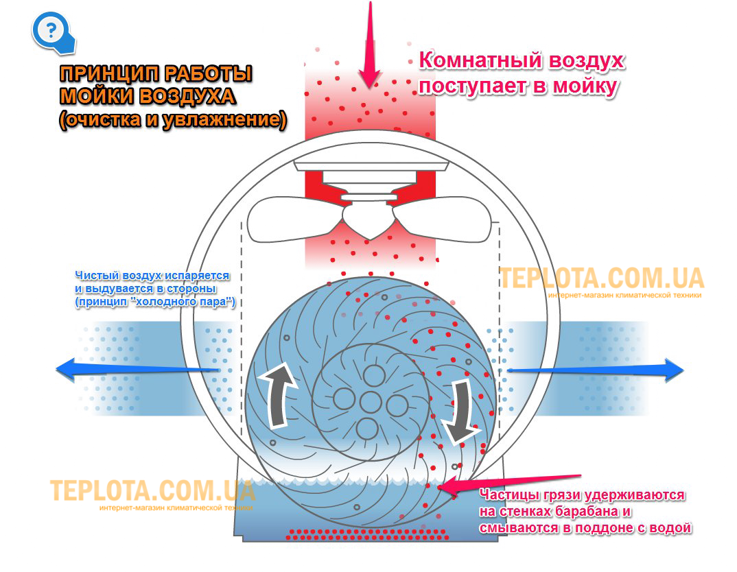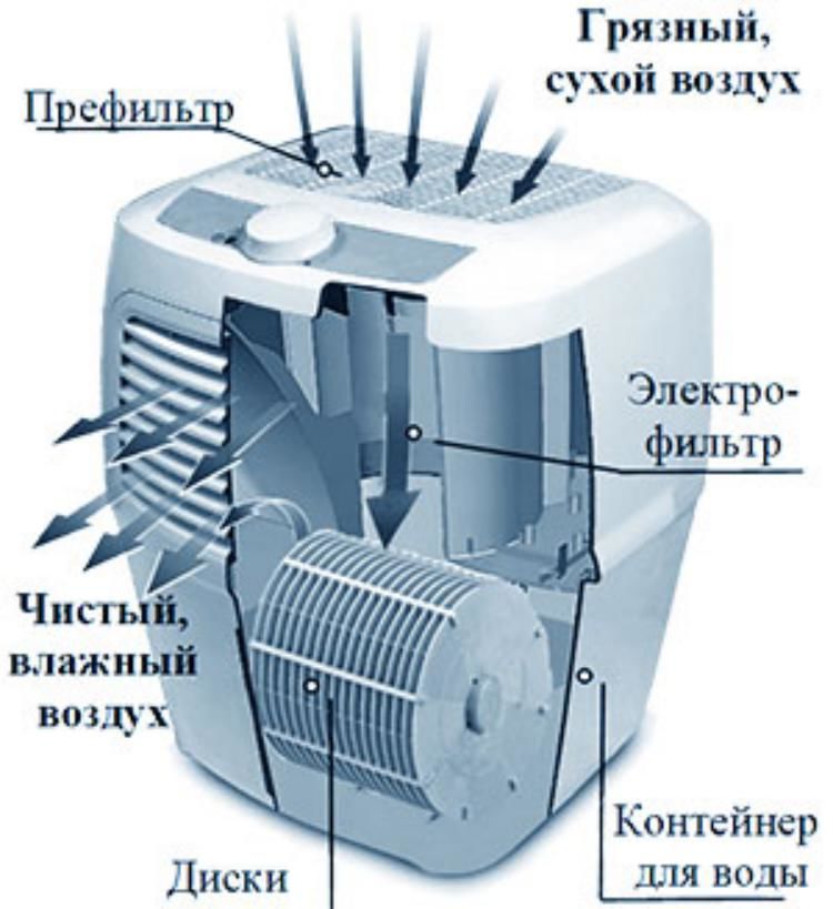 Схема работы устройства представлена на рисунке 1. Пластинчатый барабан частично погружен в емкость с водой. В процессе вращения он весь постепенно становится влажным. При помощи вентилятора через него прокачивается внутренний воздух. Проходя через мокрые пластины барабана, воздух увлажняется. Одновременно с этим пыль и частицы грязи, которые содержатся в воздухе, намокают и оседают в воде. Таким образом, воздух после барабана становится чистым и увлажнённым. Именно он подаётся в помещение.
