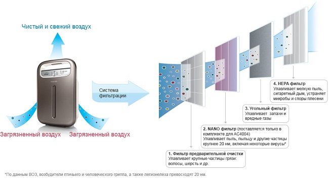 Воздухоочиститель гораздо более сложный прибор, который может одновременно увлажнять воздух и очищать его от крупных и мелких частиц, удалять запахи. Для этого воздух прогоняется через несколько специальных фильтров, которые по-разному воздействуют на него.