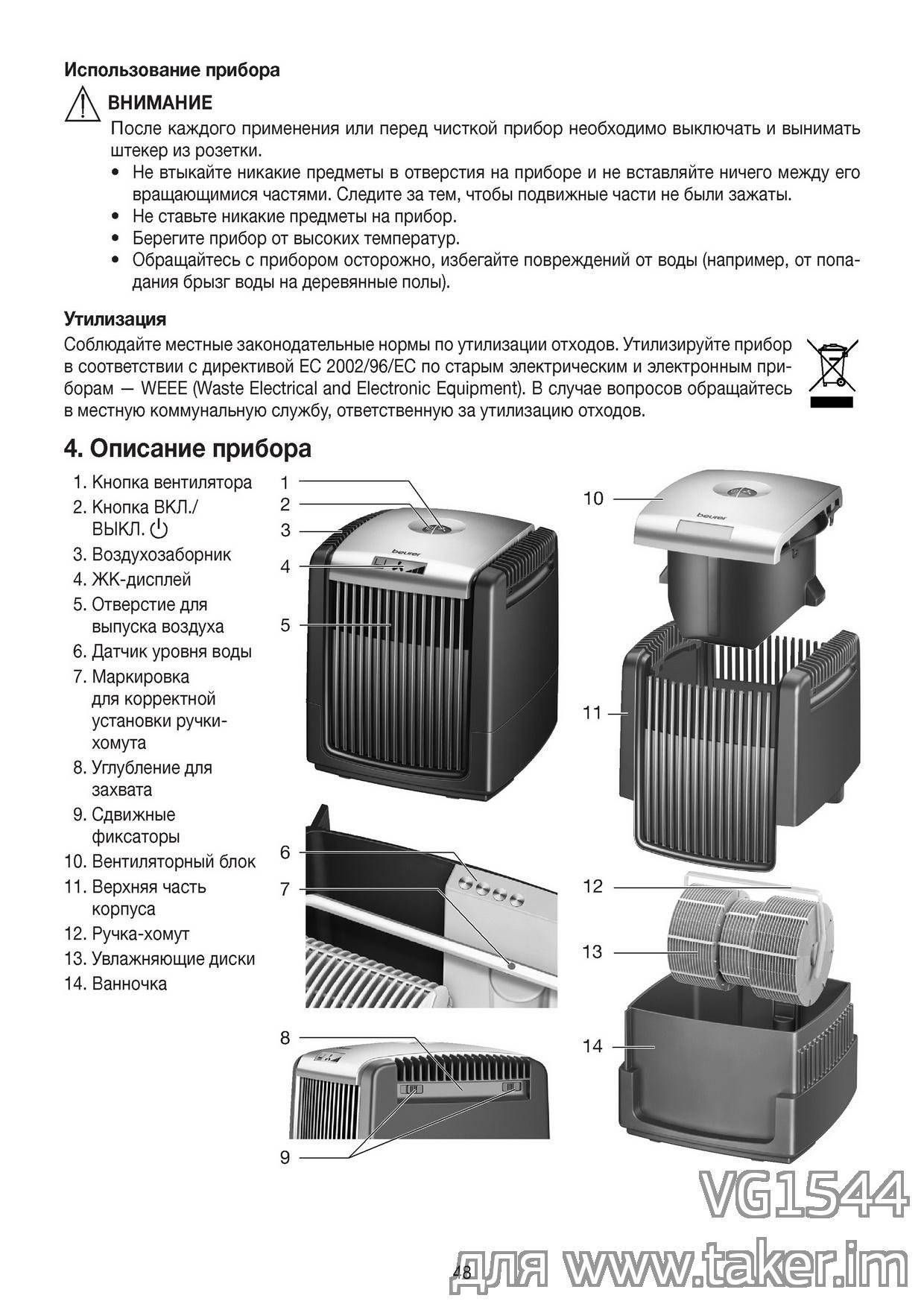 Как часто нужно мыть вращающиеся диски и поддон, зависит от уровня загрязнённости воздуха. В период привыкания к новому прибору, рекомендуется чистить его через 3 – 7 дней. Прибор сам « покажет», насколько сильно в нём успевает испачкаться вода и детали.