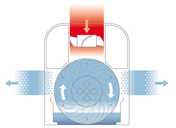 Мойка для воздуха с водным фильтром имеет практически аналогичную дисковой конструкцию. Вместо пластинчатого барабана использует специальный конус — циркуляционный нагнетатель. С его помощью создается воздушно-дисперсионная среда, пропускающая потоки воздуха для очистки и увлажнения. Вместо потока выбрасываются мелкие капельки воды.