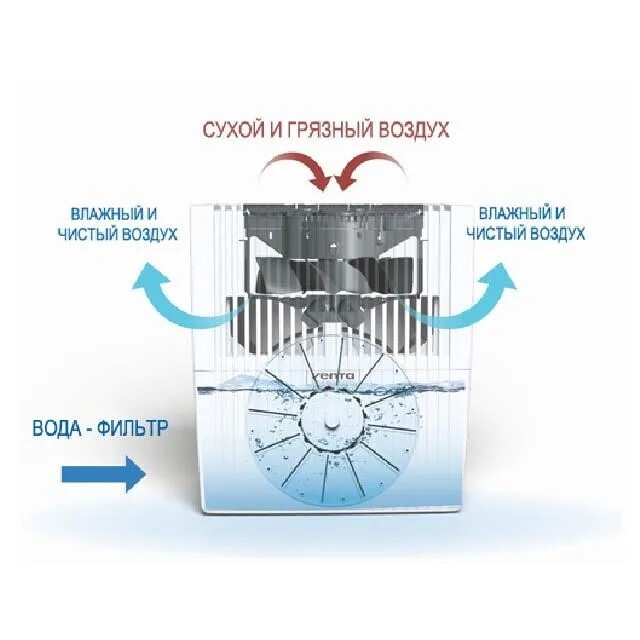 Кулер подает воздушную струю в отсек мойки. Проходя через увлажненные пластинки, загрязненные частицы связываются. Происходит их естественное набухание и утяжеление. Грязь оседает в резервуаре с жидкостью. Воздух насыщается влажностью до заданного предела. Поток, пройдя через резервуар, выдувается через несколько отверстий с обоих боков прибора.