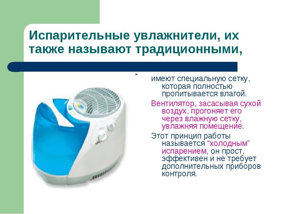 Увлажнитель с холодным испарением – основан на принципе естественного испарения и оснащен абсорбирующим фильтром, который поглощает воду. Вентилятор выдувает сухой воздух через насыщенный влагой фильтр и испаряет мелкие капельки.