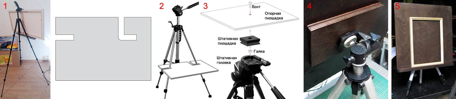 В быту нередко встречается устройство, также обладающее большим потенциалом трансформации – фото/видео штатив. Применительно к теме данной статьи это значит, что на его основе можно сделать мольберт, сочетающий в себе полезные качества треного и лиры. Причем самый штатив не потеряет пригодности к использованию по прямому назначению. Что весьма ценно, т.к. творческая фотография и живопись родственные виды искусства.