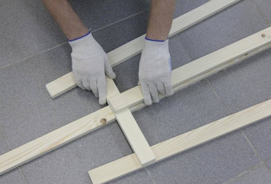 - Приступаем к сборке, которую лучше делать на полу. Карандашом чертится прямая линия, отталкиваясь от которой и будет идти сборка. Параллельно линии выкладываем рейку на 146 см. Сборку опор производим на основании 2-х реек по 168 см, а внахлест укладываются рейки по 53 и 39 см.