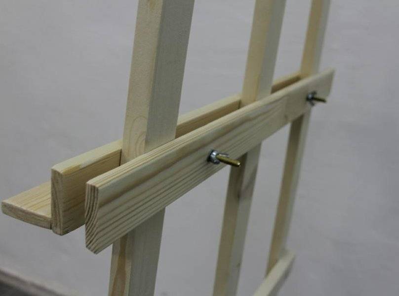 Объединить конструкцию можно так же, как для настольного мольберта. Но для большей устойчивости подойдет конструкция с укреплением планками в трех местах – сверху, посередине и снизу. К нижней планке прибавьте полочку для основания и письменных принадлежностей. Заднюю ножку прикрепите на дверную петлю к средней перекладине. Если работать предстоит с большими форматами, то дополните от середины среднюю планку выше основного полотна на необходимое расстояние.