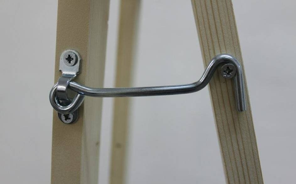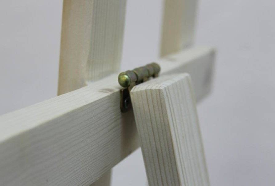Рейки материал легкий и удобный с ним могут справиться и женщины. Взяв три длинные и две рейки короче, соедините их саморезами. Точка откидной опоры фиксируется самой простой дверной петлей.