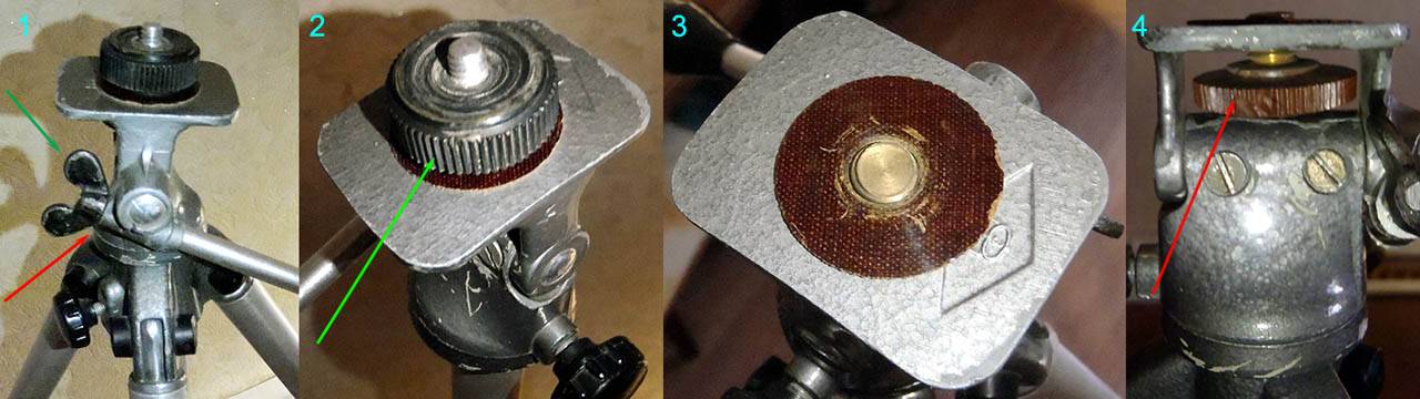 Далее, штативная площадка старых штативов несъемная. Поэтому снимаем штатный переходный винт с 3/8” (старая штативная резьба) на 1/4” (зеленая стрелка на поз. 2. Винт на 3/8” тоже невыпадающий и держится вроде бы только накладкой из текстолита (поз. 3) или тонкой стали с радиальным разрезом, но вытащить винт не получается: его головка упирается в неразборную силуминовую опору. Которая, кстати, тоже часто лопалась, и ее приходилось чинить всякими-разными способами, что и видно на поз. 4. Но винт 3/8” все равно не извлекался, разве что опору нужно было бы сломать совсем. Нет, не нужно. Надо бокорезами №4 (или №2 — №3, у кого руки-крюки) аккуратно обкусать фасонную гетинаксовую головку винта 3/8” (красная стрелка на поз. 4), и тогда его латунный сердечник «со скирипом», но вытаскивался. Во конструкция! Чисто советская в худшем смысле. Ну, а после этого поставить на штатив опорную площадку под планшет или полотно уже можно как описано выше.
