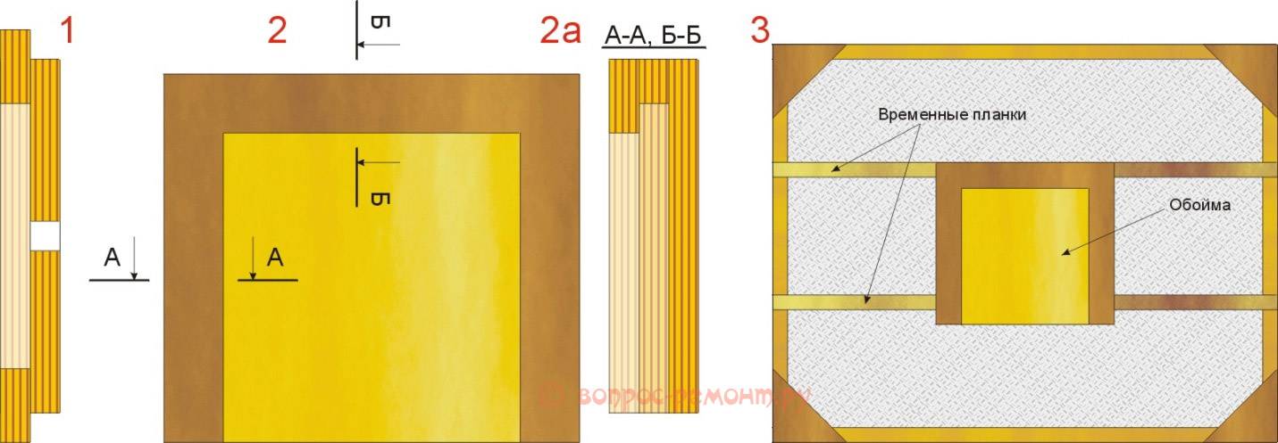 Опорная площадка выполняется из 6-10 мм фанеры 2-х ярусной, как показано в разрезе на поз. 1. Ее размеры прим. 20х25 см; вынос установочного бортика прим. 2-2,5 см. Соответственно площадке делается 3-х ярусная обойма, плотно надевающаяся на площадку сверху. Обойму крепят с тыльной стороны полотна, как показано на поз. 3, ставят его на площадку – и можно писать небо с натуры.