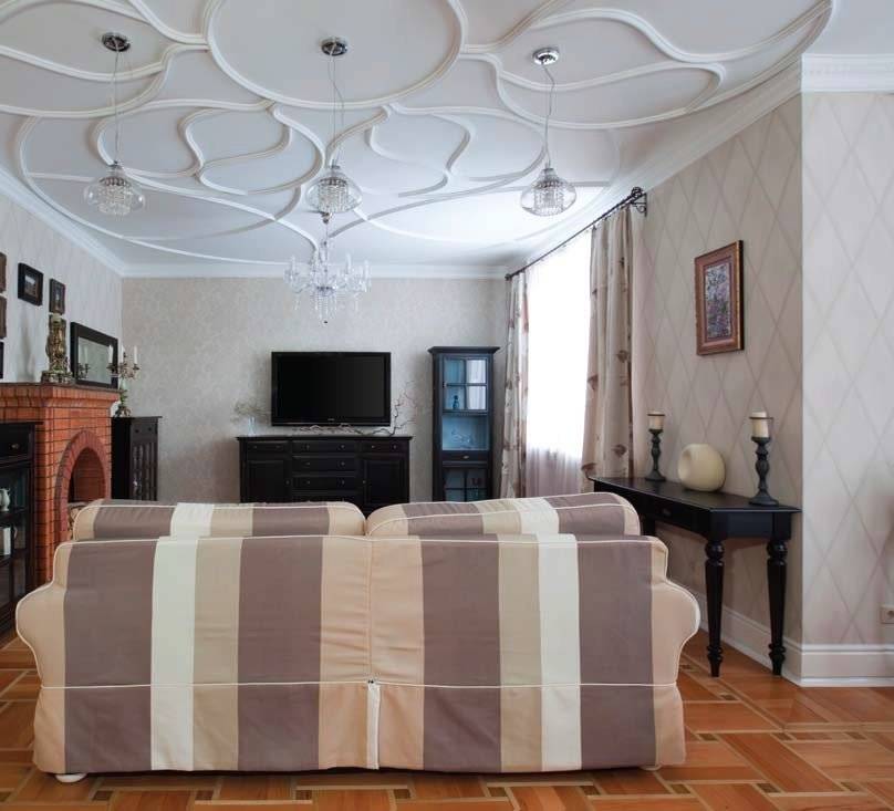 Классический стиль отличается высокими потолками с окнами в виде арок. Также резное оформление интерьера и тонированная мебель из дерева присуща этому стилю. Поэтому необходимо и рельефы молдингов подбирать по идентичному принципу.