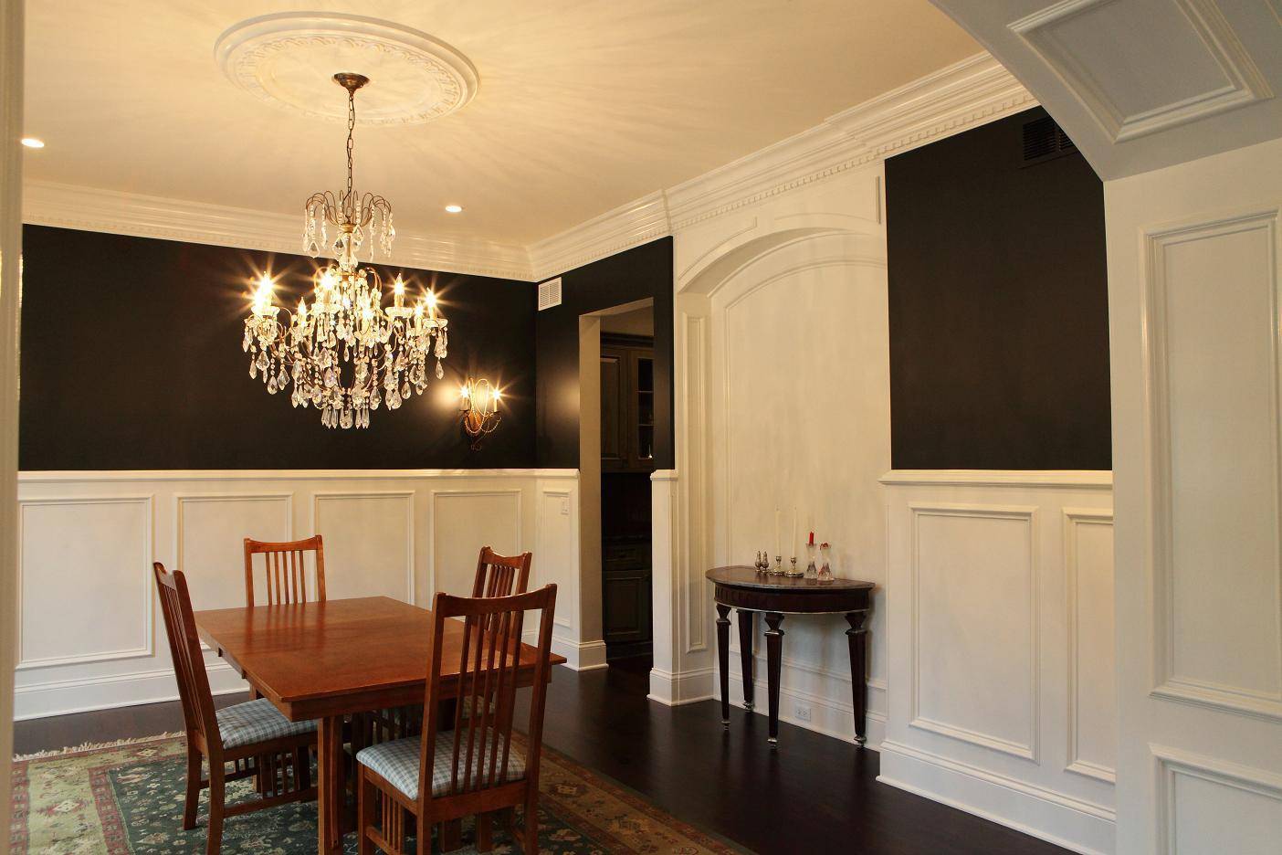Молдинг для разделения обоев часто обладает простой формой, ведь основной акцент дизайнеры делают на обоях. При этом легко сочетать полотна с вычурным узором, однотонные и пёстрые варианты. Светлые тона в верхней части стен позволяют визуально увеличить высоту потолка. Использование тёмных обоев внизу и вверху оптимально для больших комнат и позволяет создать строгий интерьер.