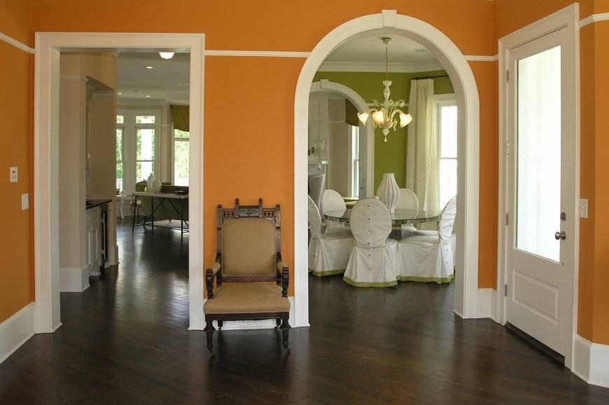 Оформление арок или проёмов без дверей молдингом позволяет выделить эти области. При этом используют планку контрастного цвета, чаще всего применяется изделие белого оттенка.