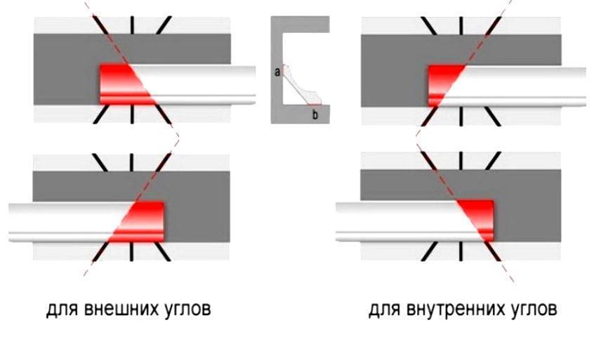 Мы рассмотрели монтаж с угловыми элементами, но можно обойтись и без них. Сначала концы планок, что помещаются в угол, при помощи стусла срезают под углом 45 градусов, после чего монтируют встык, а места соединения закрывают декоративной планкой.