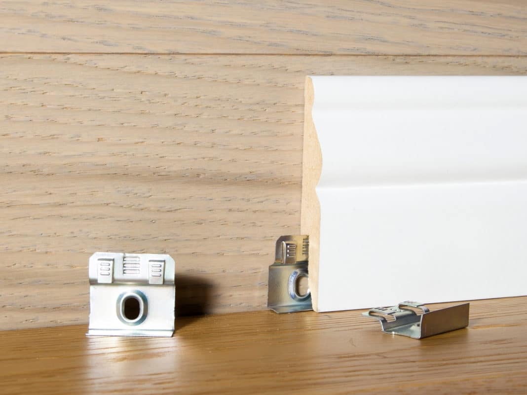 Весьма удобны плинтусы со специальными клипсами. Клипсы крепят к стене шурупами на дюбелях, после чего плинтус устанавливают простым нажатием. Иногда в комплекте содержится специальная фурнитура для монтажа и стыкования плинтуса на внутренних и наружных углах. Некоторые производители предлагают плинтусы, в которых имеется канал для укладки любых электропроводов.