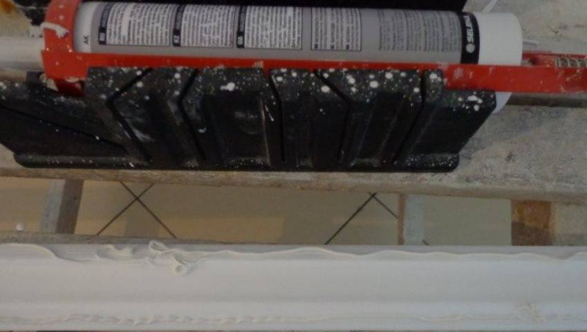 Начинать клеить галтели необходимо с самого видного места для избежания лишних стыков от подрезок. В качестве клея можно использовать как специальный клей, так и шпаклевку или акриловый герметик. Последний вариант наиболее удобен в плане монтажа.